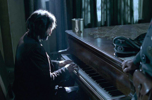 数年ぶりに、瓦礫の中のピアノに向かうシュピルマン。ピアノの左に置かれている缶詰は、瓦礫の中をさまよい、ある台所の戸棚に残っていた缶詰、缶切りがなく、開けられないまま抱え歩いてきたものだった。