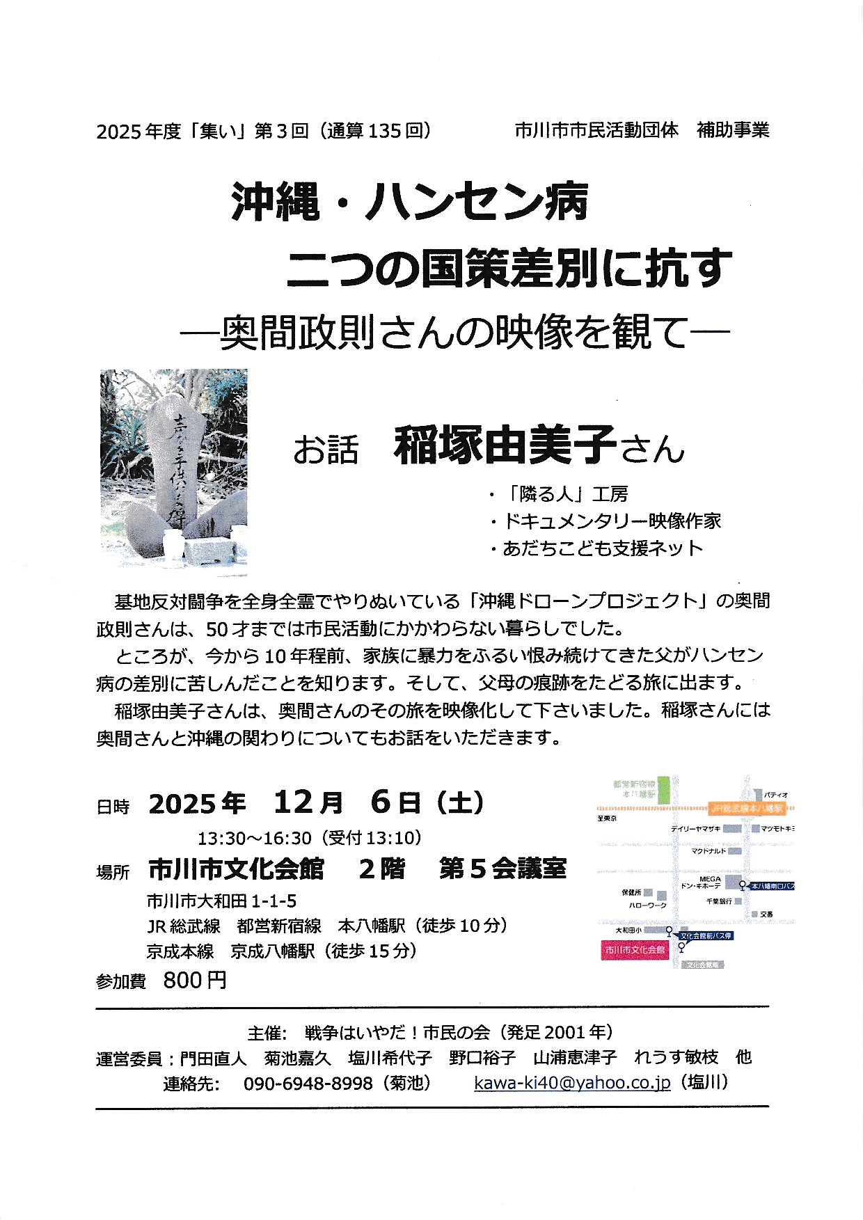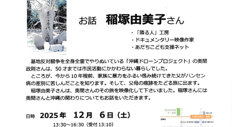 【12月6日(土)】2025年度「集い」第3回 沖縄・ハンセン病 二つの国策差別に抗すーー奥間正則さんの映像を観てーー催し物案内2025年10月19日2025年10月19日 正治安岡 No comments著者: 大井 有 : タグ: ハンセン病, 奥間正則, 戦争はいやだ!市民の会, 沖縄, 稲塚由美子Tagsハンセン病奥間正則戦争はいやだ!市民の会沖縄稲塚由美子