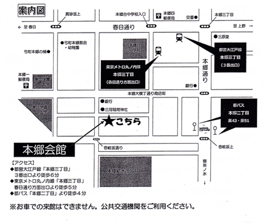 1. ところ:文京区立「本郷会館」Aルーム ――地下鉄丸ノ内線 本郷三丁目駅下車5分 文京区本郷2-21-7 Tel:3817-6618