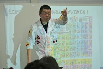 そのユニークさは当日のいでたちによっても一目瞭然。研究室用の白衣にお手製のピカピカ光る部品が手縫いで取り付けられ、正面に立たれた途端にみんながひきつけられました。学習会は言葉によってだけでなく、持ち込まれた小さなフイルムケースに入ったもののにおいを嗅ぐ、下敷きで髪の毛を逆立てるなど、参加者を巻き込みながらの「体験」で始まりました。そしてその先には、私たちの日常の「分かり方」が通用しない「感覚では分からない放射性物質」の存在とその性格の紹介が用意されていました。子どもたちも大人たちも、最初からひきつけられ、身を乗り出して「参加モード」に入りっぱなしです。
