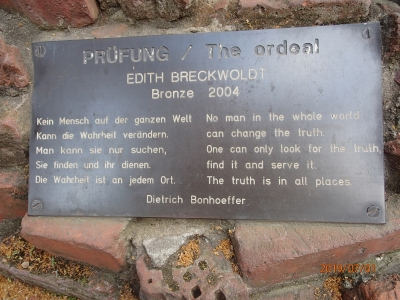 2004年に作成され銘板の右には英文が記されている。「世界中のだれ一人も真実を変えることができない。人は真実を求め、見出し、供することができる。真実はあらゆる場所にある デイートリヒ ボンヘッファー」とでも訳す?(2019年7月1日撮影)