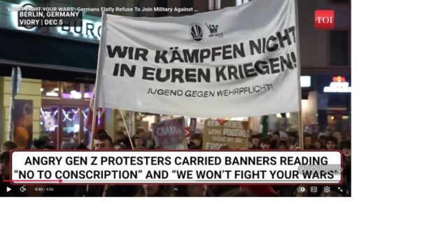 12月5日、ベルリンでの学校ストライキ ホームメードの「戦争と戦え ー (KRIEG DEM KRIEG)」と書かれたプラカードを掲げる若者 [Source: Times of India]