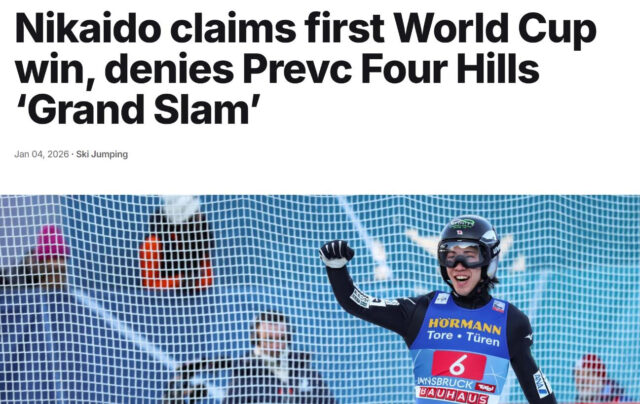 スキージャンプのW杯第14戦インスブルック大会(兼ジャンプ週間第3戦)で、二階堂漣がW杯初優勝を飾った。W杯初勝利そのものは大きな記事になるものではないが、この大会が伝統のジャンプ週間(4大会)の一つであることに特別の意義がある。さらに、ジャンプ週間の第1戦、第2戦で他の選手に大差をつけて優勝し、無双状態にあるスロヴェニアのドメン・プレヴツ選手の4戦全勝(グランドスラム)を阻止する歴史的な勝利だったから、欧州のスポーツ配信ニュースでは大きく取り上げられた。札幌の大倉山のように街外れの高台にあるインスブルックは他の台と違ってヒルサイズが小さく、飛距離が伸ばせないだけでなく、風の影響をもろに受ける。グランドスラムを狙うジャンパーにとって鬼門の台である。絶好調のプレヴツがこの台を凌げばグランドスラムは確実だと考えられていたが、その懸念が現実化した。