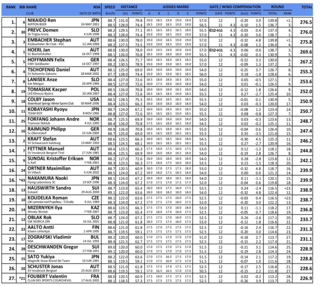 その後、ポーランドのストック(2017/2018年シーズン)と小林陵侑(2018/2019年シーズン)がグランドスラムを達成した。今シーズン無双状態のプレヴツが史上4人目のグランドスラム cargo を達成するかどうかが、今大会の話題の中心だった。これを阻止できるとすれば、小林陵侑だろうというのが専門家の一致した見解だったが、伏兵二階堂にグランドスラムの夢を砕かれてしまった。わずか0.5ポイント差(二階堂が276.5点、プレヴツが276.0)だった。2位プレヴツと3位のエンバッハー(オーストリア)の差もわずか0.2ポイントで、上位3選手の戦いは稀に見る接戦だった。