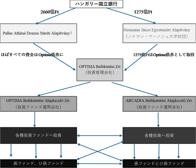 マトルチ国立銀行総裁は就任して間もない2014年に、国立銀行出資による財団設立を提案し、与党Fideszはそれを可能にする法律を制定した。なぜそのようなスキームを考案したのかついては、「ブダペスト通信」(2025年4月2日、https://www.morita-from-hungary.com/j-07/07-01/2025/250402_012.pdf)を参照されたい。続く2015年に財団が100%所有する投資管理会社OPTIMA Befektetési Zrt.(当初の名称は、Pallas Athéné Domus Optima Zrt.)を設立し、2017年には財団が100%所有する投資運用会社(OPTIMA Befeketetési Alapkezelő Zrt.とARCADIA Befeketetési Alapkezelő Zrt.)を設立した。明らかに、最初から財団設立と投資管理・運用会社設立がセットになったスキームである。