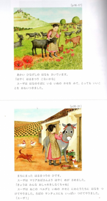 広野多珂子(1947~)は、夫とともにスペインで美術を学び、帰国後のスペインのオリーブ畑に囲まれた小さな村で暮らす少女スーザとおばあさんとロバたちが繰り広げる物語は「ねぼすけスーザシリーズ」として7冊を成している(1991~2014 福音館書店)。明るくて、やさしくて、善意の人たちとの触れ合いの中で進む話に癒される思いであった。