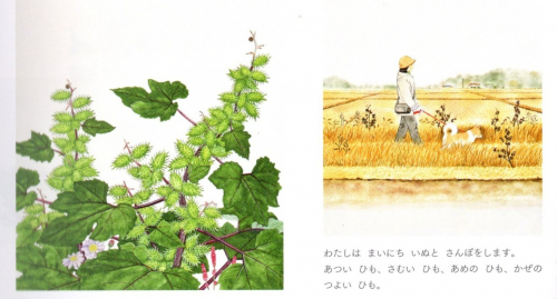「さんぽみちのオナモミ」(2016年 福音館書店)、「原画絵本展」カタログから。科学絵本の中の一冊。2003年年佐倉に転居、散歩の犬にも引っ付いてくるオナモミのなり立ちを精密なタッチで描く。右の絵は、京成臼井か佐倉への車窓から見える風景である。
