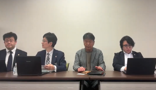 松竹伸幸氏の共産党除名撤回裁判の報告会。右から二人目が松竹氏。YouTubeから