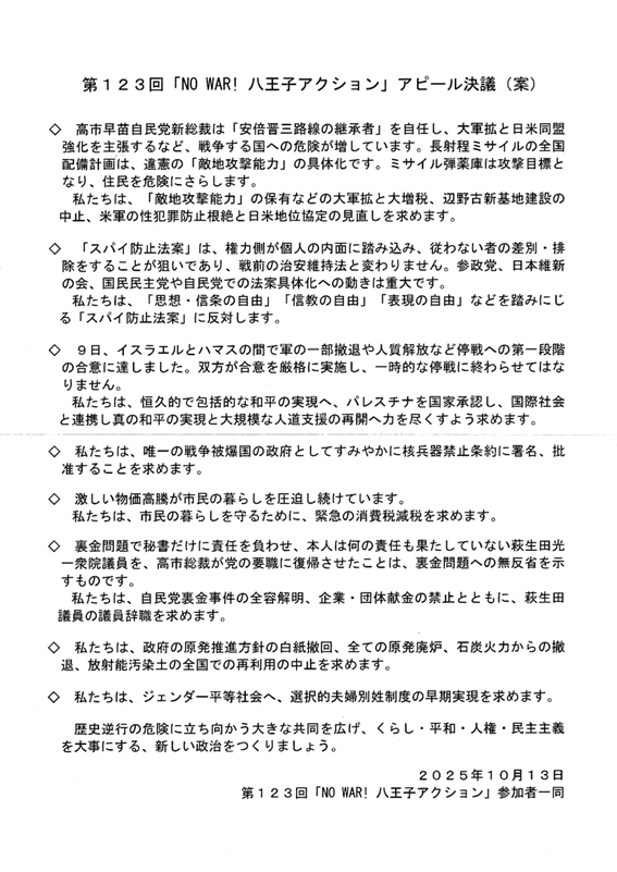 • 第123回「NO WAR! 八王子アクション」アピール決議