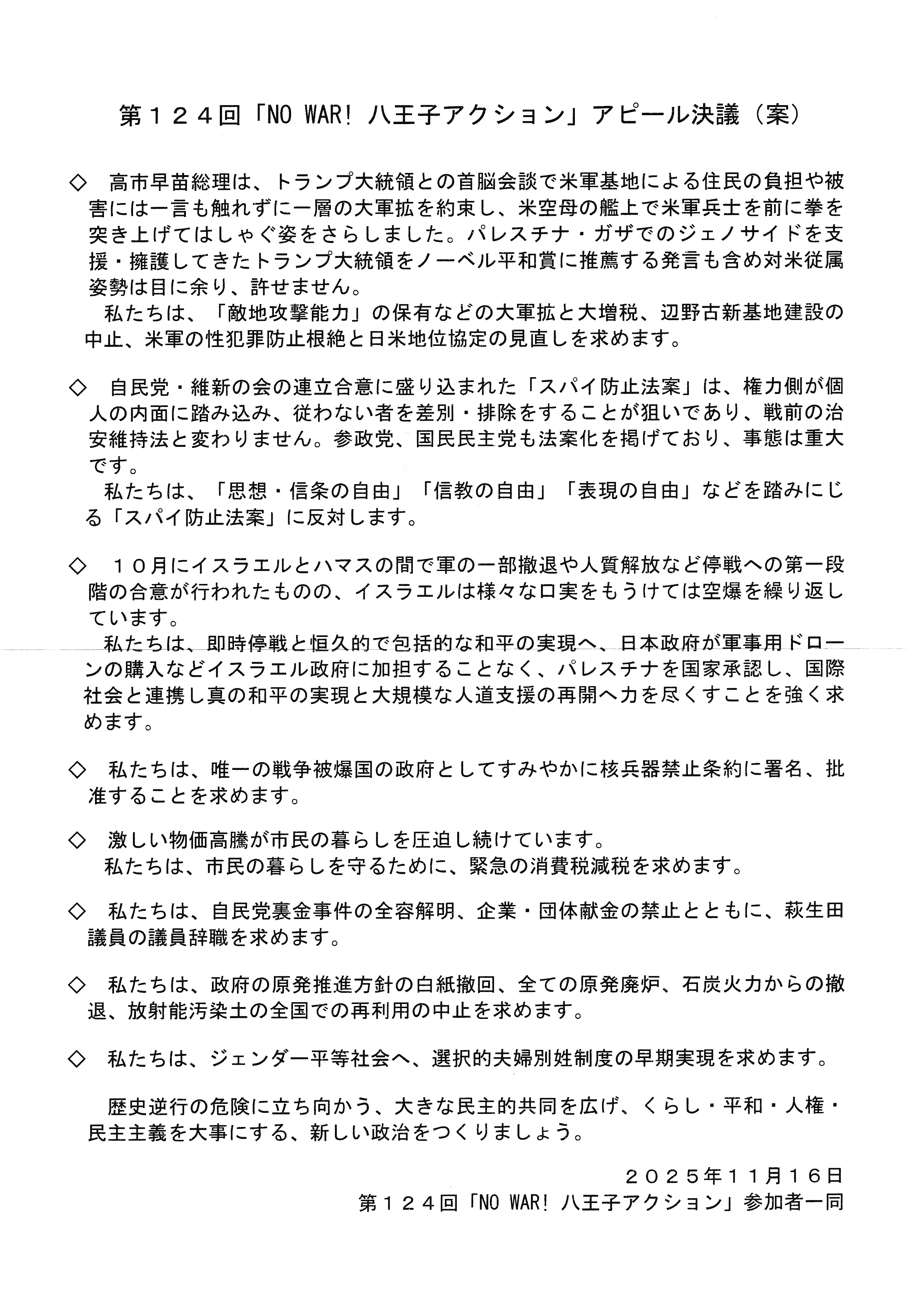 • 第124回「NO WAR! 八王子アクション」アピール決議