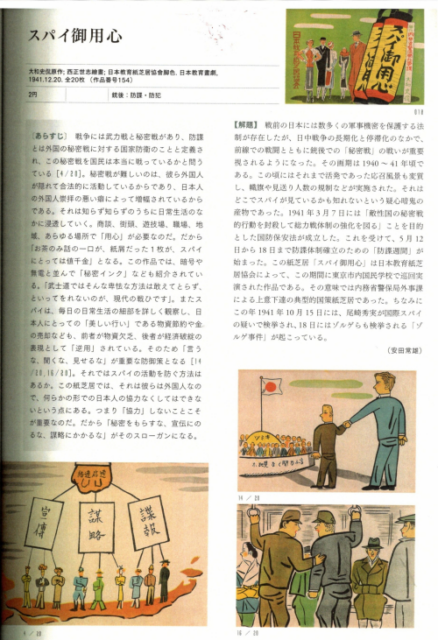 ところで、必要があって、神奈川大学非文字資料研究センターの『国策紙芝居から見る日本の戦争』(「戦時下日本の大衆メディア」研究班編著 勉誠出版 2018年2月)を繰っていたら、つぎのような紙芝居「スパイ御用心」を見つけた。解説によれば、1941年12月20日公開、日本教育紙芝居協会によって東京市内の国民学校で巡回実演された作品という。日本が真珠湾攻撃をした12月8日直後の作品である。前年の40年11月10日には紀元2600年記念式典が国を挙げて行われ、12月6日には内閣情報部が「内閣情報局」に格上げされていた。この紙芝居には、以下のような背景があった。1941年に入ると3月7日には「国防保安法」が成立、太平洋戦争開戦の直前の10月15日はゾルゲ事件で尾崎秀実が逮捕され、10月18日には東条英機内閣が成立しているのである。