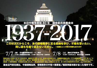7月7日。「七夕の日」であること以外には日本人の頭をスルーしてしまう日なのかもしれない。今年のその日は、日本の中国への侵略戦争が全面戦争かするきっかけとなった「盧溝橋事件」の80周年です。この日を記憶し、もう二度と戦争は行わないとの誓いを新たにするための「日中戦争開始80年 国会前市民集会」が7月7、8日に開催されます。主催は植松青児さんら「日中戦争80年市民フォーラム」です。以下ポスターを見てください。東京新聞にも報道されました。「レイバーネットTV第122号 : あなたは7・7を知っています?〜日中戦争80年を考える」も観てください。