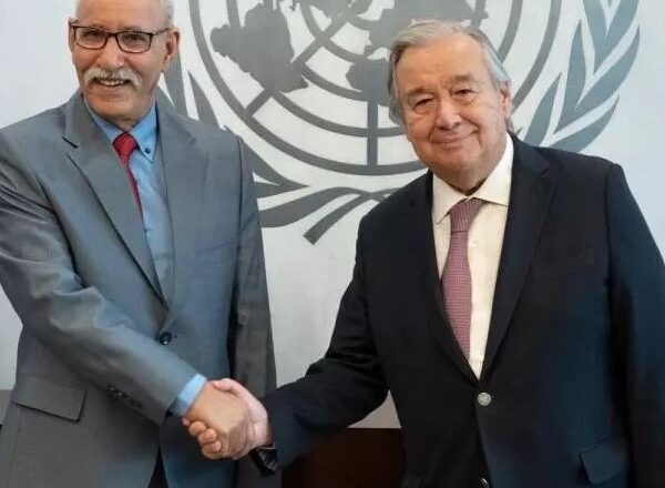 左にブラヒム・ガリ西サハラ・アラブ民主共和国大統領兼ポリサリオ戦線事務総長、右にアントニオグテーレス・国連事務総長